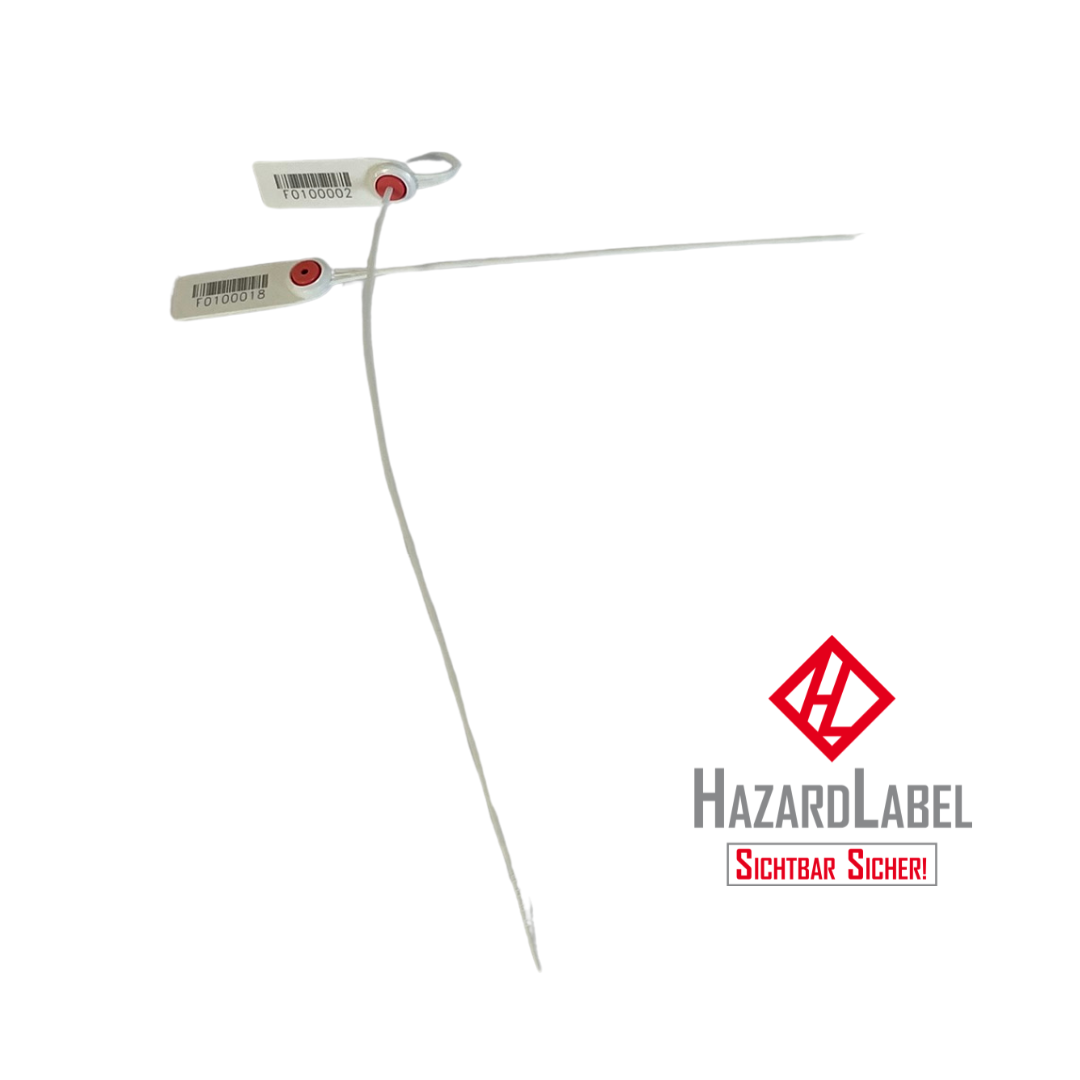 Diese Ausführung kommt in Weiß mit roter Verschlusskappe und ist mit einem Barcode 128 bedruckt. Jede Plombe trägt ein Präfix "F" sowie eine fortlaufend 7‑stellige Nummer, wodurch eine eindeutige Identifikation jederzeit gewährleistet ist.