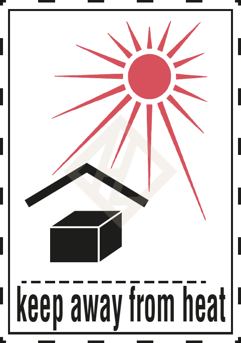 Das Etikett verfügt über ein markantes, international verständliches Layout: Auf einem weißen Hintergrund befindet sich ein rotes Warnsymbol (die Sonne) und der deutlich lesbare Text „KEEP AWAY FROM HEAT“. Damit ist auf einen Blick erkennbar, dass das Paket bei heißem Wetter, starker Sonneneinstrahlung oder in heißen Lagerräumen nicht ungeschützt gelagert oder transportiert werden darf.